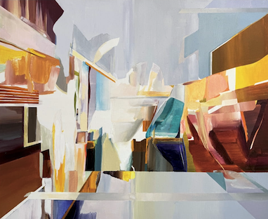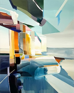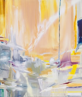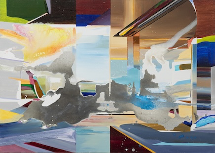 In den menschenleeren, rätselhaften Gemälden und Papierarbeiten gibt es nicht nur ein Oben und Unten, ein Rechts und Links, einen Vorder- und Hintergrund. Hier treffen Interieurs auf Glasfronten, Treppenaufgänge auf Hochhausfassaden, Bergketten auf Topfpflanzen. Landschaft und Innenräume werden aufgefächert und gesplittet, verzahnen sich mit- und ineinander zu etwas gänzlich Neuem. Klar umrissene scharfe Linien definieren architektonische Elemente, die sich wiederum in ungegenständlichen Motiven verlieren. So entsteht eine Gleichzeitigkeit verschiedener Ebenen und Malweisen.